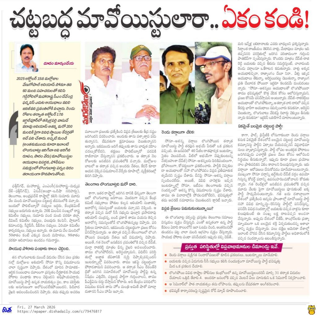 (దూడం మార్కండేయ) గురువారం సీపీఐ ఆఫీసుకు దేవ్జీ, మల్లా రాజిరెడ్డి తదితరులు వస్తారని వచ్చిన వార్తల నేపథ్యంలో తెలంగాణ రాజకీయాల్లో కొత్త చర్చ మొదలైంది. ఏ కారణం వల్లనో వారి ఆ సందర్శన రద్దయినా, చర్చ మాత్రం కొనసాగుతూనే ఉంది. గత నెలాఖరులో రాష్ట్ర డీజీపీ శివధర్రెడ్డి సమక్షంలో లొంగిపోయిన దేవ్జీ వర్గం.. తాము రాజకీయ జీవితం కొనసాగిస్తామని, చట్టబద్ధమైన పద్ధతుల్లొ ప్రజల పక్షాన పోరాడతామని చెప్పిన విషయం తెలిసిందే. వీరి లొంగుబాటు సమయంలో ఆయుధాలు అప్పగించక…